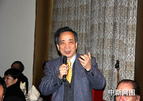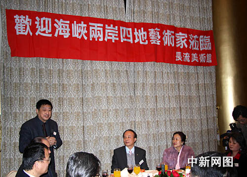 10日晚,臺(tái)灣長(zhǎng)流美術(shù)館在臺(tái)北圓山飯店宴請(qǐng)前來參加活動(dòng)的兩岸及港澳三十多名畫家。(中)為臺(tái)灣長(zhǎng)流美術(shù)館館長(zhǎng)黃承志。(左一)致辭者為中國油畫家學(xué)會(huì)副會(huì)長(zhǎng)張祖英。 中新社記者陳立宇 攝