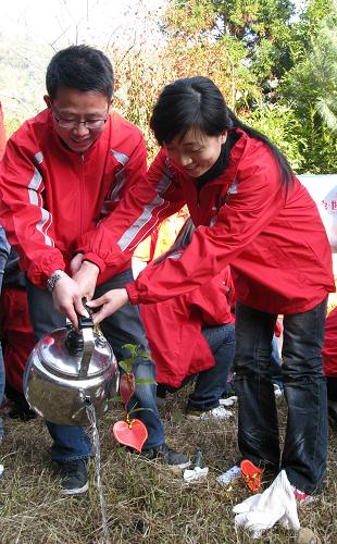 1月13日,一對新人在阿里山為剛種下的“喜愿樹”澆水。新華社記者王妍攝
