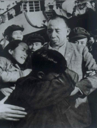 1958年劉連仁回國時與妻兒在天津碼頭相見。(圖片來源:中國人民抗日戰(zhàn)爭紀念館)