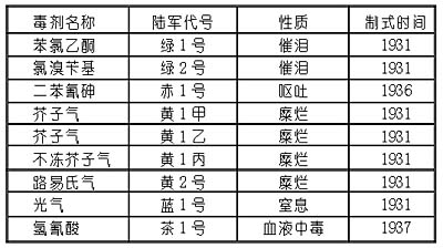 至1937年,日本陸軍將研究和改進(jìn)的化學(xué)武器加以制式化,正式列為裝備軍隊(duì)的武器。這時(shí),正式確定為日本陸軍使用的化學(xué)毒劑有:(見下表)
