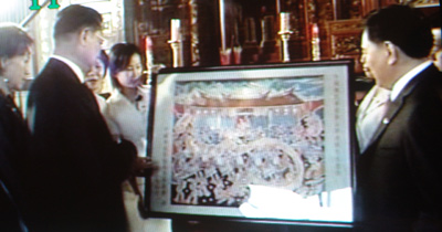 隨后,馬崎連氏宗親贈送給連戰(zhàn)六份禮物,分別是家鄉(xiāng)馬崎的米、水、農(nóng)民漆畫作品《盛世祥和》、象征團結友愛的桂圓干、當?shù)剞r(nóng)民書法作品以及新修訂的連氏族譜。