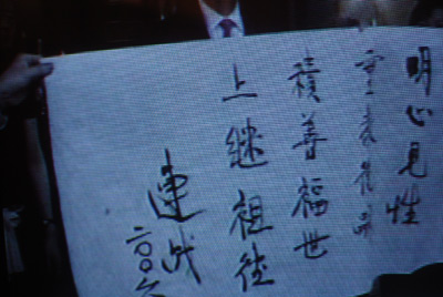 進行完禮物贈送之后,連戰(zhàn)來到連氏宗祠前,揮毫題詞:明心見性,垂教后嗣,積善福世,上繼祖德,表達對先祖的崇敬和緬懷之情。