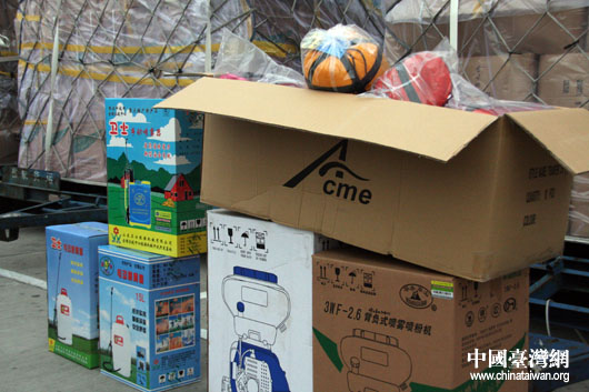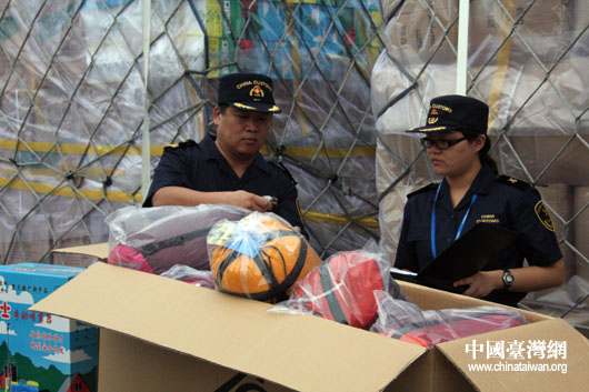 海關(guān)人士檢查即將啟運(yùn)的救災(zāi)物資。(中國(guó)臺(tái)灣網(wǎng) 鐘寶華 攝)