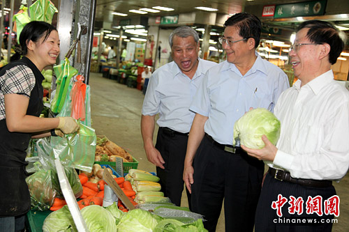 5月20日上午,以海峽兩岸農(nóng)業(yè)交流協(xié)會(huì)名譽(yù)會(huì)長身份首度訪臺(tái)的農(nóng)業(yè)部副部長危朝安參觀臺(tái)北農(nóng)產(chǎn)運(yùn)銷公司第二果菜批發(fā)市場,嘗水果、問菜價(jià)。圖為危朝安(右)拿起一棵高麗菜,與女菜農(nóng)親切交談。 中新社發(fā) 董會(huì)峰 攝