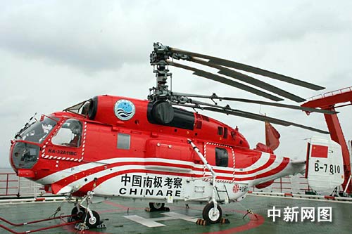 在“雪龍”號(hào)船尾的停機(jī)坪上,記者見(jiàn)到了中國(guó)南極考察首架自備卡-32直升飛機(jī)。由于在航行過(guò)程中需要存放在船上的機(jī)庫(kù)中,所以飛機(jī)螺旋槳的旋翼還未展開(kāi)。船員告訴記者,該型直升機(jī)吊掛能力可達(dá)4噸,是以前船載機(jī)型的4倍左右,成為南極地區(qū)目前使用的最大噸位直升機(jī)。它可直接進(jìn)行船岸之間來(lái)回運(yùn)輸,更好地滿(mǎn)足南極新老三座考察基地的物資保障需求。另外,“雪龍”號(hào)此次科考任務(wù)同樣將配備兩架直升飛機(jī),除了該架自備卡-32外,另外一架從國(guó)外租借的直升飛機(jī)將在新西蘭上船。