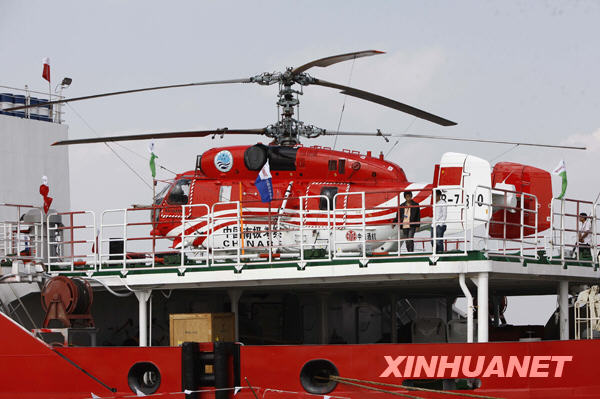 “雪龍”號(hào)上的我國(guó)南極考察首架自備卡-32型直升機(jī)(10月10日攝)。新華社記者 裴鑫 攝