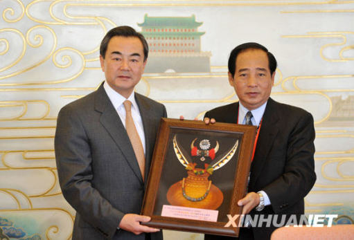 12月22日,王毅接受臺灣少數(shù)民族代表人士訪問團(tuán)贈(zèng)送的禮品。新華社記者 金良快 攝