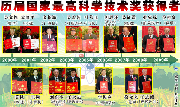 國家最高科學技術(shù)獎自2000年設(shè)立,歷屆獲獎?wù)叻謩e為:2000年,吳文俊、袁隆平;2001年,王選、黃昆;2002年,金怡濂;2003年,劉東生、王永志;2004年空缺;2005年,葉篤正、吳孟超;2006年,李振聲;2007年,閔恩澤、吳征鎰;2008年,王忠誠、徐光憲,2009年,孫家棟、谷超豪。
