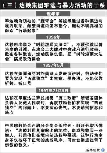 “達(dá)賴口口聲聲自詡是‘藏民族代言人’,我們可以看看他到底干了些什么。這些年,他不是圖謀‘西藏獨(dú)立’,就是充當(dāng)國(guó)際反華勢(shì)力的滑稽工具;不是在西藏散布反動(dòng)謠言,就是阻撓正常的社會(huì)秩序。尤其是最近的‘3·14’事件,嚴(yán)重影響了西藏各族人民的生產(chǎn)生活秩序。”西藏自治區(qū)黨委宣傳部理論處的陳銳說(shuō),“達(dá)賴干的哪一件事代表了藏族人民的意愿和根本利益?他完全在拖西藏進(jìn)步的后腿!