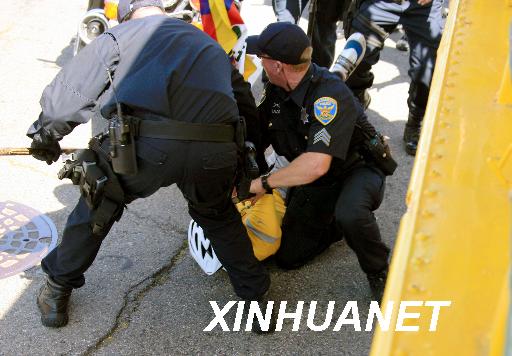 當(dāng)?shù)貢r(shí)間4月9日,北京時(shí)間4月10日,奧運(yùn)火炬在美國舊金山傳遞時(shí),一名企圖搶奪火炬的“藏獨(dú)”分子被當(dāng)?shù)鼐飚?dāng)場制服。新華社記者李穎攝