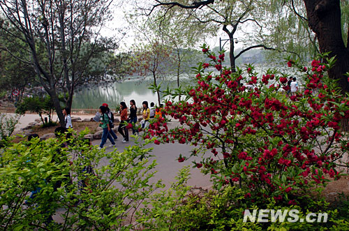 4月19日,學(xué)生從桃花盛開的北京大學(xué)未名湖畔走過(guò)。新華網(wǎng) 文濤 攝