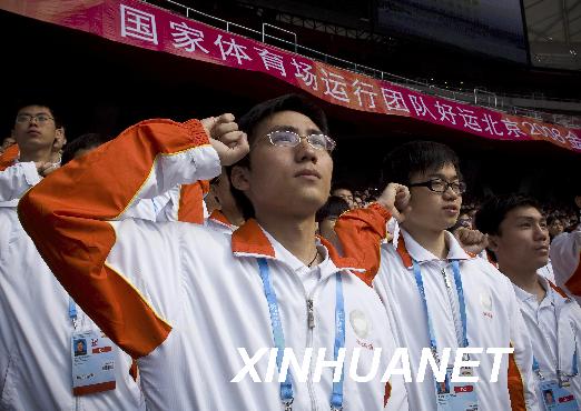 2008年4月15日,志愿者在國(guó)家體育場(chǎng)(“鳥(niǎo)巢”)宣誓。當(dāng)日,來(lái)自北京大學(xué)、北京體育大學(xué)等首都高校的3000多名志愿者在國(guó)家體育場(chǎng)(“鳥(niǎo)巢”)參加誓師大會(huì),他們將為即將舉行的“好運(yùn)北京”國(guó)際田聯(lián)競(jìng)走挑戰(zhàn)賽和北京國(guó)際馬拉松賽提供服務(wù)。新華社記者劉杰攝