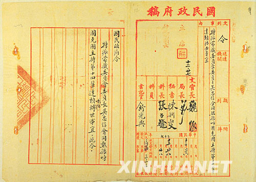 這是1938年國(guó)民政府特派蒙藏委員會(huì)主任吳忠信主持第十四世達(dá)賴?yán)镛D(zhuǎn)世事宜的令。 新華社發(fā)