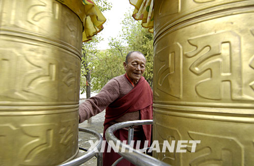 4月28日,一名僧人在色拉寺內(nèi)轉(zhuǎn)經(jīng)筒。 當(dāng)日,西藏拉薩“三大寺”之一的色拉寺向信教群眾和游客恢復(fù)開放,這標(biāo)志著受“3·14”事件影響的西藏主要寺廟開始逐步全面恢復(fù)對(duì)外開放。 新華社記者普布扎西攝