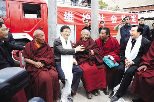 帶著黨中央、國(guó)務(wù)院和胡錦濤總書記、溫家寶總理對(duì)西藏各族人民的深切關(guān)懷,3月23日至24日,國(guó)務(wù)委員、公安部部長(zhǎng)孟建柱率中央工作組深入拉薩市的街道、社區(qū)、寺廟、派出所等地,視察了西藏在拉薩“3·14”嚴(yán)重打砸搶燒暴力事件后維護(hù)穩(wěn)定工作及社會(huì)秩序恢復(fù)情況。