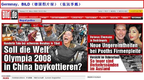 這是尼泊爾警察用棍棒驅(qū)趕示威者的圖片,被德國(guó)圖片報(bào)冠以“西藏?cái)?shù)百人死亡,抵制中國(guó)2008奧運(yùn)會(huì)?”的標(biāo)題。