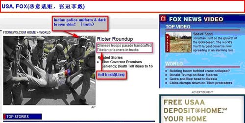 美國(guó)FOX新聞網(wǎng)將一張印度軍人拖走示威者的圖片,配上“中國(guó)軍隊(duì)將示威者拷走”的說(shuō)明。