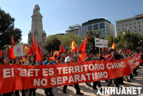 4月14日,西班牙上千名華人華僑和留學(xué)生在馬德里市中心的西班牙廣場舉行游行集會活動,反對西藏分裂,反對西方歪曲報(bào)道,維護(hù)統(tǒng)一,支持北京奧運(yùn)。 新華社記者陳海通攝