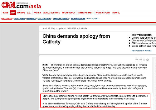 CNN在不久前關(guān)于西藏事件的報(bào)道,就曾惡意剪裁圖片,并“誤稱”西藏為“國(guó)家”,顯示其所謂的新聞自由在偏見(jiàn)主宰下,常常干出渲染夸張﹑移花接木﹑斷章取意﹑指鹿為馬的奇事。而此番卡弗蒂于奧運(yùn)火炬在歐美數(shù)國(guó)遭遇阻撓的敏感時(shí)刻,大開罵戒,則亮出了他勢(shì)與中國(guó)和中國(guó)人過(guò)不去的架式與底牌,更喪失了一個(gè)媒體人的公正與風(fēng)度。難怪中國(guó)網(wǎng)民已經(jīng)流傳“做人不要太CNN!