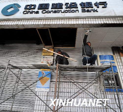 工人在裝修遭到破壞的拉薩朵森格路建行分理處店面。新華社記者 覺果 攝
