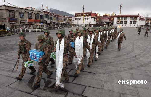 拉薩執(zhí)勤武警身披哈達(dá)。3月21日,拉薩大昭寺的僧人向在大昭寺廣場上執(zhí)勤的武警官兵敬獻(xiàn)哈達(dá),他們還為官兵們送上了生活慰問品。中新社發(fā) 廖攀 攝