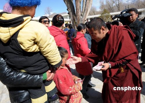 在拉薩市救助站內(nèi)接受救助的一對母女。3月22日,拉薩大昭寺的僧人到拉薩救助站慰問打砸搶燒事件中的受害者,并向他們發(fā)放了慰問金。中新社發(fā) 廖攀 攝