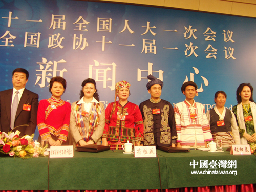 中國臺(tái)灣網(wǎng)3月10日北京消息 今天下午,八位出席十一屆全國人大一次會(huì)議的少數(shù)民族代表,在梅地亞多功能廳接受中外記者采訪。(趙穎芳)