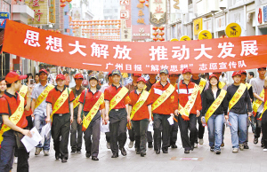 廣州日?qǐng)?bào)紅色方陣高舉“思想大解放,推動(dòng)大發(fā)展”橫幅備受市民關(guān)注。 顧展旭 攝