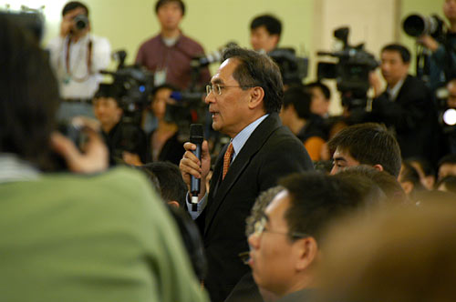 3月18日,國務(wù)院總理溫家寶和副總理李克強(qiáng)、回良玉、張德江、王岐山在北京人民大會(huì)堂與中外記者見面,并回答記者提問。圖為美國有線新聞網(wǎng)的記者在提問。新華網(wǎng) 郭毅 攝