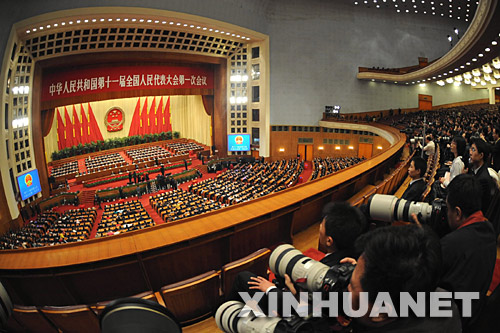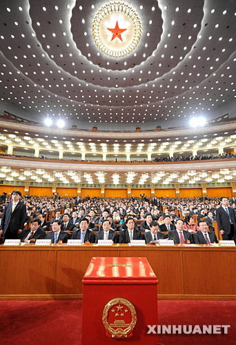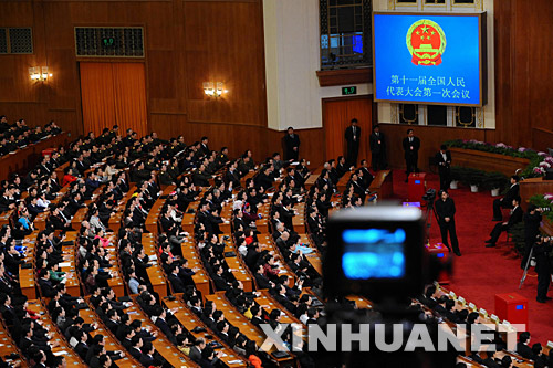 3月16日,十一屆全國人大一次會議在北京人民大會堂舉行第六次全體會議。決定國務院總理人選;決定中華人民共和國中央軍事委員會副主席、委員人選;選舉最高人民法院院長;選舉最高人民檢察院檢察長。這是大會會場。