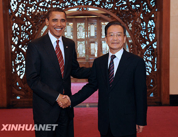 11月18日,中國國務(wù)院總理溫家寶在北京釣魚臺國賓館會見正在中國進(jìn)行國事訪問的美國總統(tǒng)奧巴馬。新華社記者 馬占成 攝