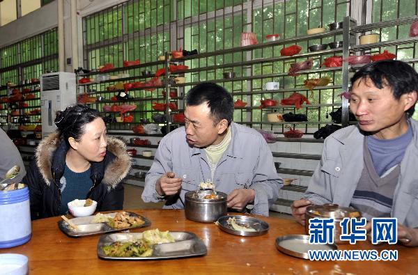 農(nóng)民工全國人大代表胡小燕——為全國兩會做好準(zhǔn)備胡小燕(中)在公司生產(chǎn)車間食堂和工友們交流(2月16日攝)。在廣東佛山打工十幾年,胡小燕獲得過公司所在地白坭鎮(zhèn)“十佳外來工”、三水區(qū)“十佳外來工”、佛山市“十佳外來工”稱號,2008年1月21日,經(jīng)過廣東省十一屆人大一次會議第三次全體會議無記名投票,她成為中國第一位農(nóng)民工全國人大代表。胡小燕現(xiàn)在在佛山市三水新明珠建陶工業(yè)有限公司工作。在完成日常工作的同時,她認(rèn)真地履行職責(zé)。去年兩會,她提交了5項涉及農(nóng)民工權(quán)益的建議,諸如醫(yī)保轉(zhuǎn)移、子女教育、技能培訓(xùn)、工傷賠付等。一年來,她所關(guān)注的還是農(nóng)民工子女入學(xué)、空巢老人等與農(nóng)民工息息相關(guān)的議題。全國兩會在即,胡小燕也在積極為兩會做著最后的準(zhǔn)備。新華社記者 陳曄華攝