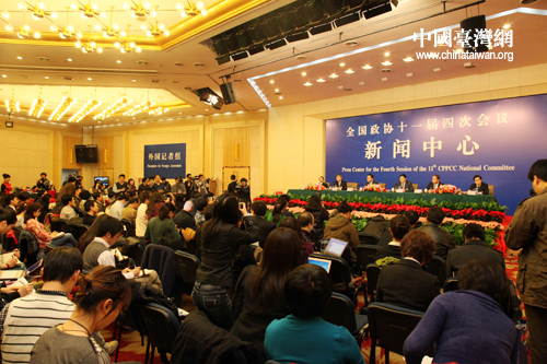 中國(guó)臺(tái)灣網(wǎng)3月5日北京消息 3月5日下午14時(shí)30分,全國(guó)政協(xié)十一屆四次會(huì)議在梅地亞兩會(huì)新聞中心舉行記者會(huì),主題是“政協(xié)委員談協(xié)調(diào)推進(jìn)城鎮(zhèn)化與新農(nóng)村建設(shè)”。全國(guó)政協(xié)委員蔡繼明、王健林、錢克明、李成貴、吳焰出席并回答記者的提問(wèn)!。▌⒀、張魏波攝影報(bào)道)