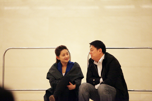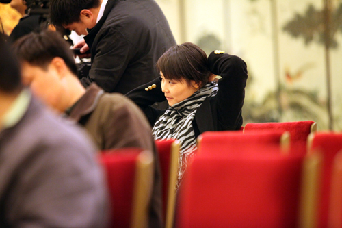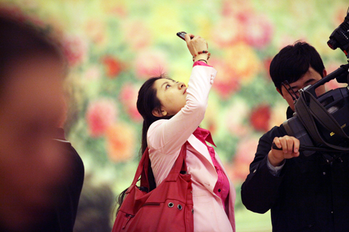 在政協(xié)記者會(huì)前,北京電視臺(tái)的女記者用手機(jī)拍下金色大廳發(fā)到微博上。