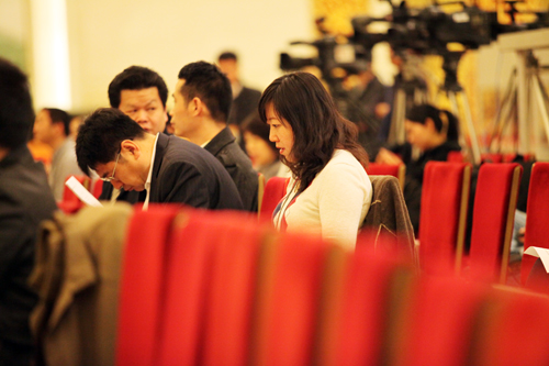 早早來(lái)到會(huì)場(chǎng)的一位女記者和同事聊天。(記者南南、劉洋、張魏波攝影報(bào)道)
