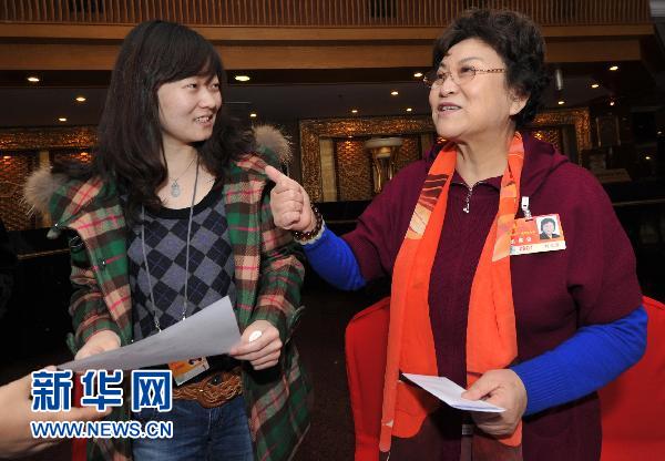 3月1日,全國政協(xié)委員劉蘭芳(右)在北京國際飯店和工作人員交流。當日,參加全國政協(xié)十一屆四次會議的全國政協(xié)委員陸續(xù)抵達北京各駐地報到。 新華社記者 岳月偉 攝