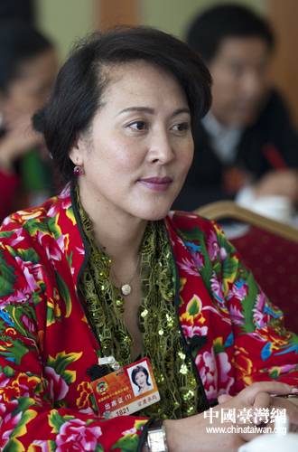 圖為全國政協(xié)委員宗庸卓瑪身著民族服飾參加會議。