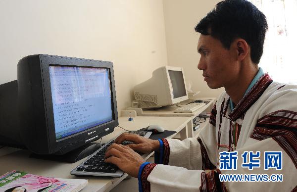 這是全國人大代表包布魯在云南省西雙版納傣族自治州景洪市基諾山基諾族鄉(xiāng)中心小學用電腦整理教學資料(2月25日攝)。新華社記者 藺以光 攝