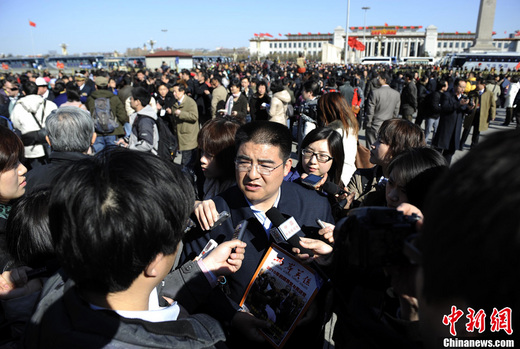 3月3日下午,全國政協(xié)十一屆四次會議在北京人民大會堂開幕。圖為大會開幕前,全國政協(xié)特邀委員、“中國首善”陳光標(biāo)被記者包圍采訪。中新社發(fā) 劉震 攝