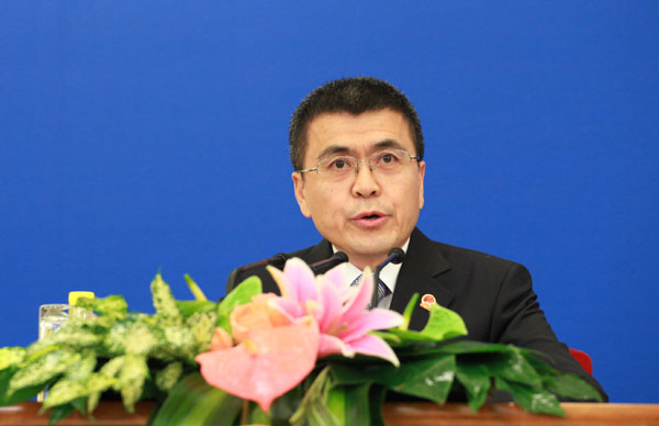 3月7日上午10點(diǎn),十一屆全國(guó)人大四次會(huì)議在人民大會(huì)堂三樓大廳舉行中外記者會(huì),由外交部部長(zhǎng)楊潔篪就外交政策和對(duì)外關(guān)系問(wèn)題答記者問(wèn)。圖為全國(guó)人大常委會(huì)副秘書(shū)長(zhǎng)、記者會(huì)主持人曹衛(wèi)洲。 吳莼攝