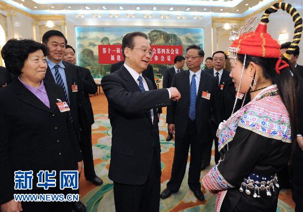 3月10日,中共中央政治局常委、國務(wù)院總理溫家寶參加十一屆全國人大四次會議福建代表團(tuán)審議。這是溫家寶總理與來自福建的全國人大代表交談。新華社記者馬占成攝