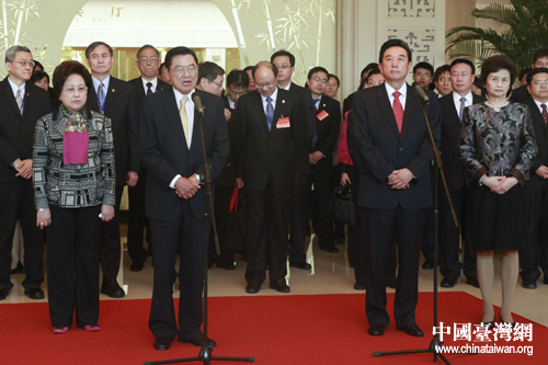 圖片說明:出席第七次兩岸兩會領(lǐng)導(dǎo)人會談的;鶗麻L江丙坤一行今日中午抵達(dá)天津,海協(xié)會會長陳云林及相關(guān)人員在天津迎賓館歡迎;鶗䥇f(xié)商代表團的到來。(中國臺灣網(wǎng) 陳佳慧 攝)
