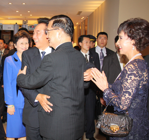4日晚間,國民黨榮譽主席連戰(zhàn)在臺北國賓飯店宴請海協(xié)會會長陳云林一行。這是連戰(zhàn)與夫人在宴會廳入口迎接陳云林與夫人,兩位老朋友在臺灣熱情相擁。(田云鵬 攝)