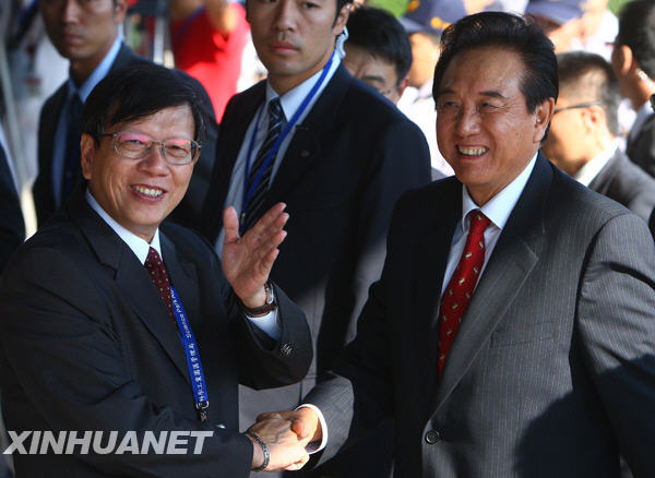 11月5日,陳云林(右)和新竹科學(xué)工業(yè)園區(qū)管理局局長(zhǎng)顏?zhàn)诿魑帐。?dāng)日,海協(xié)會(huì)會(huì)長(zhǎng)陳云林參觀新竹科學(xué)工業(yè)園區(qū)。新華社記者 邢廣利 攝
