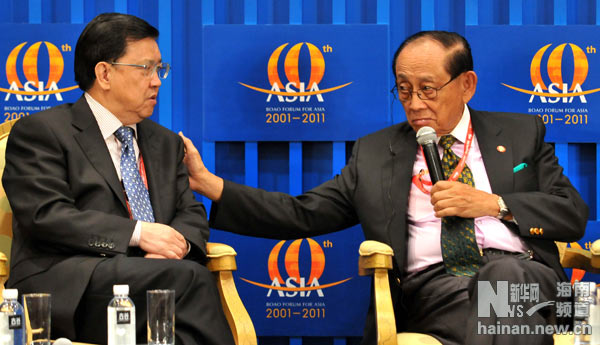 4月13日,博鰲亞洲論壇前任理事長、菲律賓前總統(tǒng)拉莫斯(右)和博鰲亞洲論壇前任秘書長龍永圖在交談。