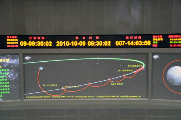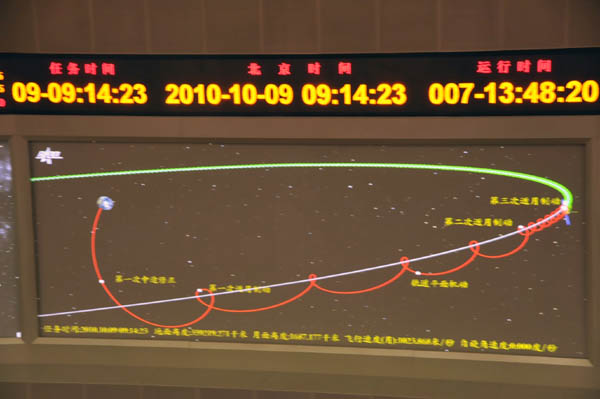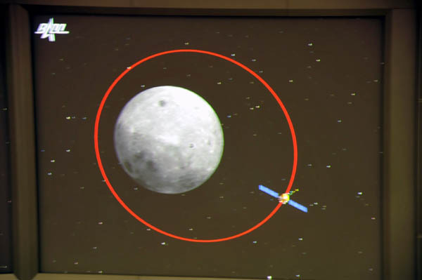 北京飛控10月9日將對嫦娥二號衛(wèi)星進行第三次近月制動,確保衛(wèi)星順利進入高度為100公里的環(huán)月圓軌道。圖為完成第二次近月制動后的嫦娥二號衛(wèi)星運行軌道模擬圖。新華網(wǎng) 孫瑞博攝