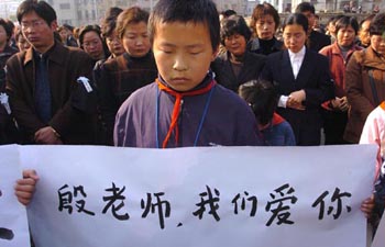 “天堂里沒有車來車往,殷老師一路走好!”4月7日,全市舉行追悼大會,挽聯(lián)為:“永恒的瞬間,瞬間的永恒。”靈車所到之處,沿途送別的群眾達10萬人之多!一位網(wǎng)友寫道:“在遙遠的西部大山深處,我看著網(wǎng)上殷老師的遺像潸然淚下。殷老師,你的壯舉讓我知道,在這個物欲橫流的時代,也還有真正的英雄!