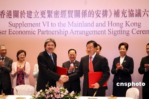 五月九日,《內(nèi)地與香港更緊密經(jīng)貿(mào)關系安排》補充協(xié)議六簽署儀式在香港政府總部舉行,行政長官曾蔭權與其它嘉賓的見證下,商務部副部長姜增偉[右]與財政司司長曾俊華簽署了協(xié)議。 中新社發(fā) 洪少葵 攝