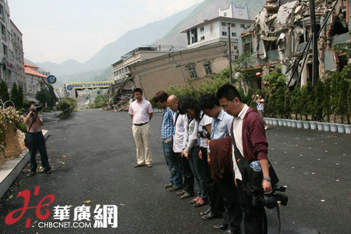 聯(lián)合采訪團(tuán)在北川地震遺址為逝者默哀。攝影:吳勇 圖片來源:四川臺辦