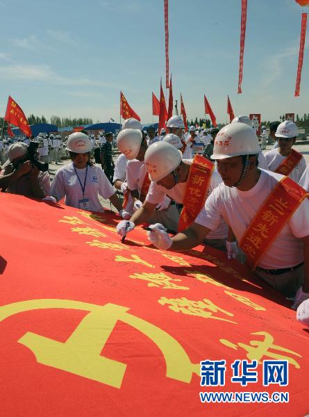 6月28日,工地上的黨員建設(shè)者簽名開展迎接建黨89周年爭創(chuàng)先進(jìn)活動。當(dāng)天,正在建設(shè)中的蘭(州)新(疆)鐵路二線工程新疆段舉行了建黨89周年紀(jì)念及黨員突擊隊授旗儀式。參加該工程建設(shè)的中國中鐵四局近千名建設(shè)者隆重宣誓,以共產(chǎn)黨員的先鋒模范帶頭作用,克服施工困難,高質(zhì)量嚴(yán)要求地完成國家重點(diǎn)建設(shè)工程。新華社記者王雷攝